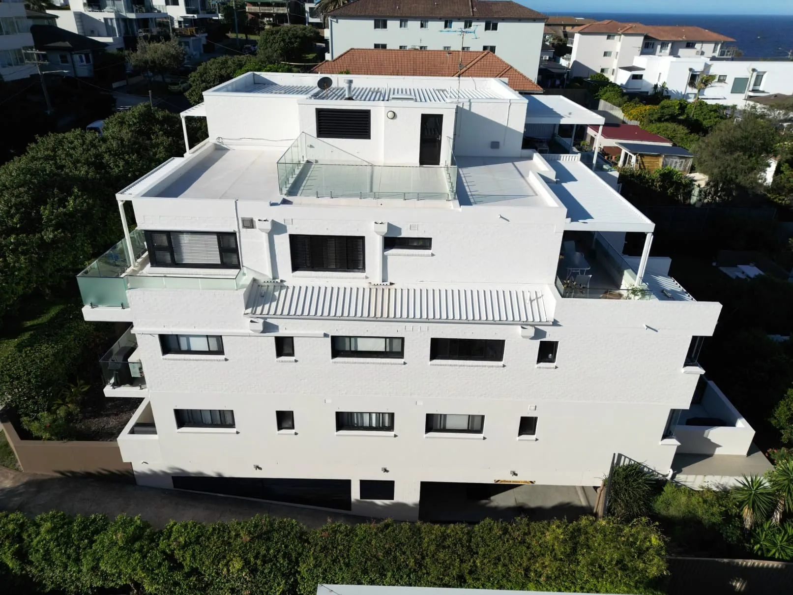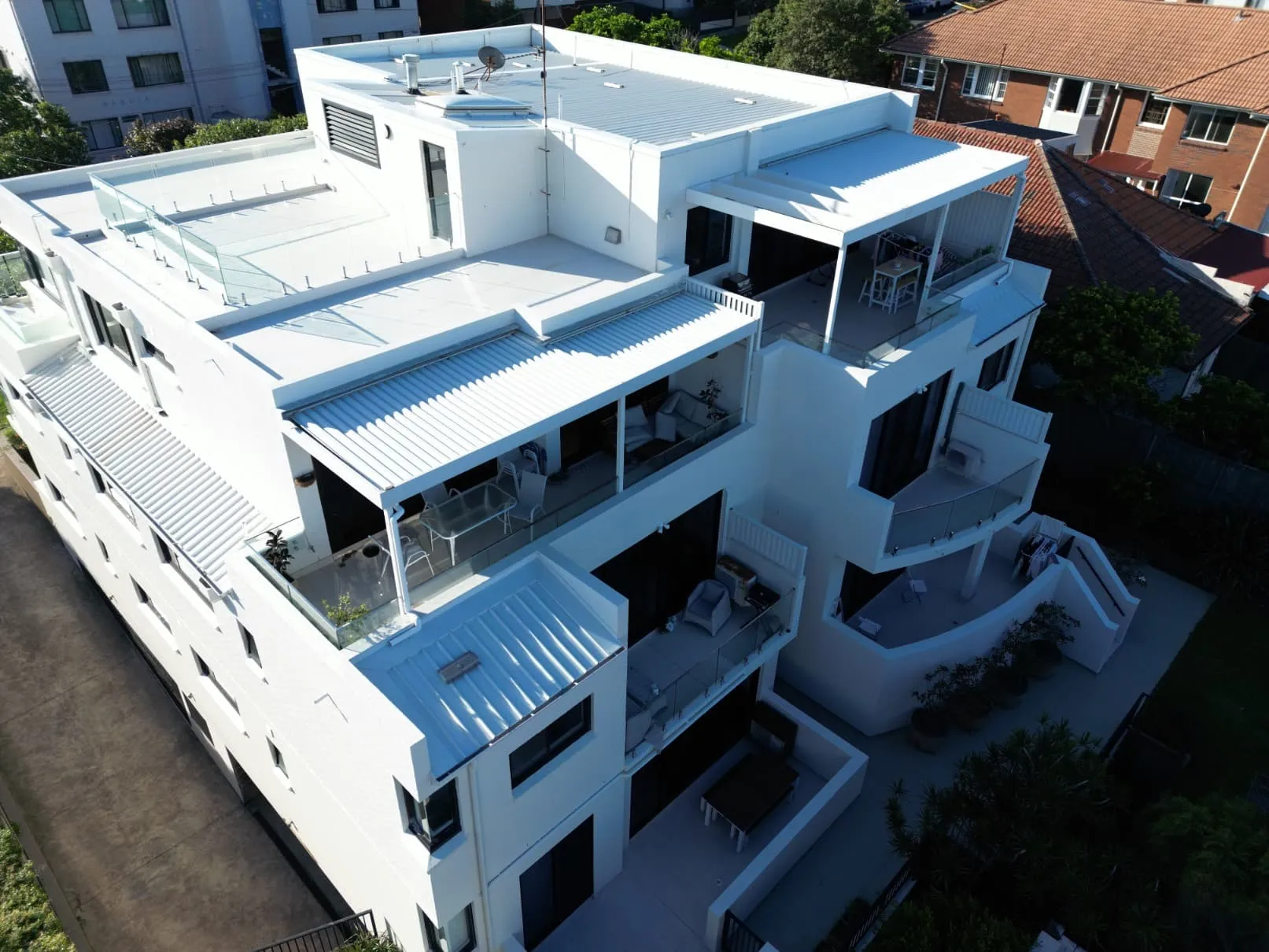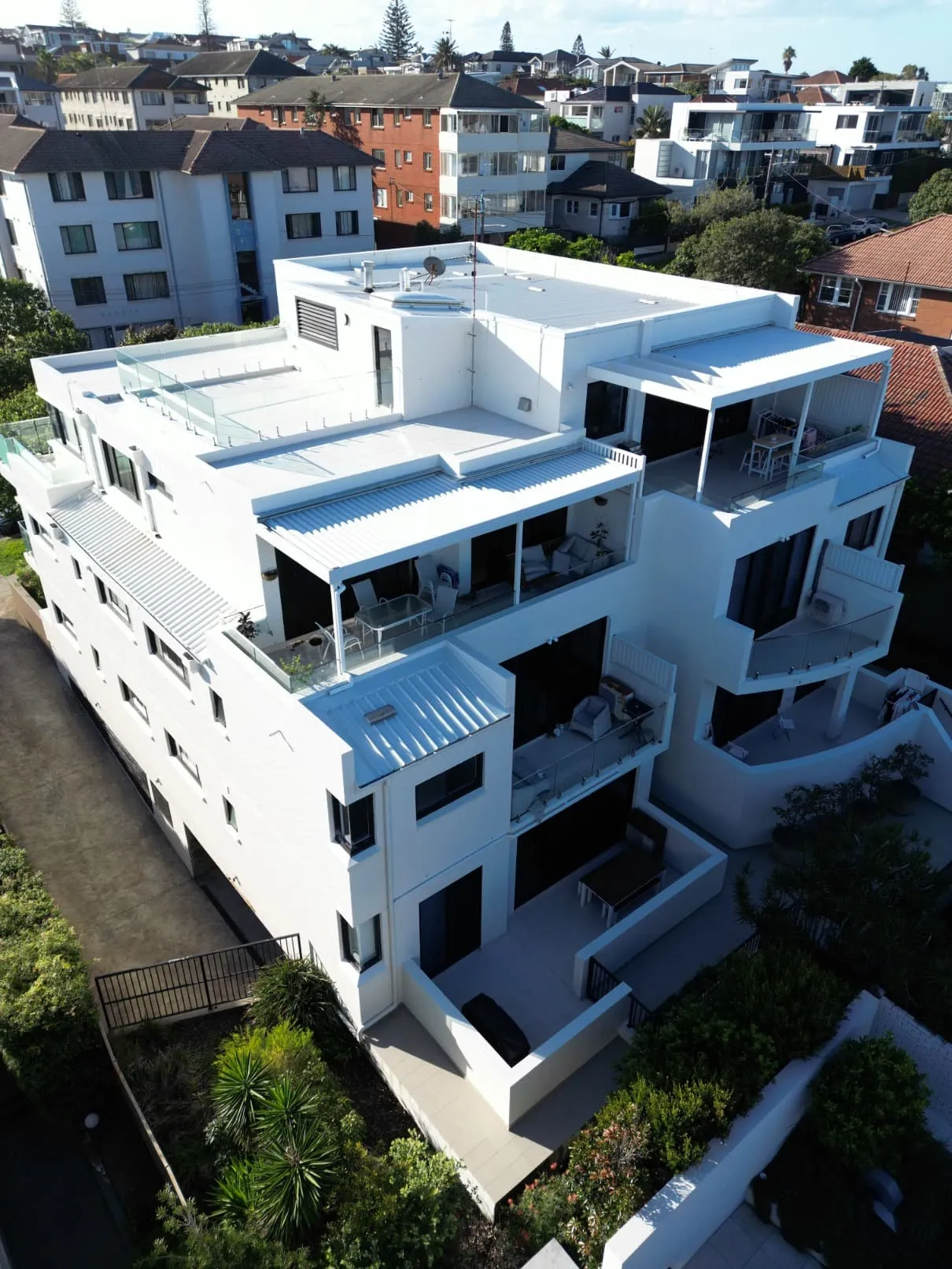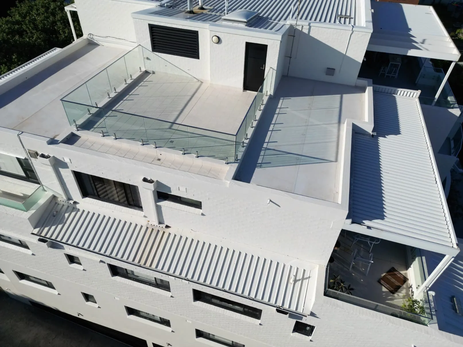 Our scope included metal roof and waterproofing system replacement, complete balcony upgrades including membranes, balustrades, doors, and floor finishes, concrete treatment and rendering repairs, and a full external commercial repaint.