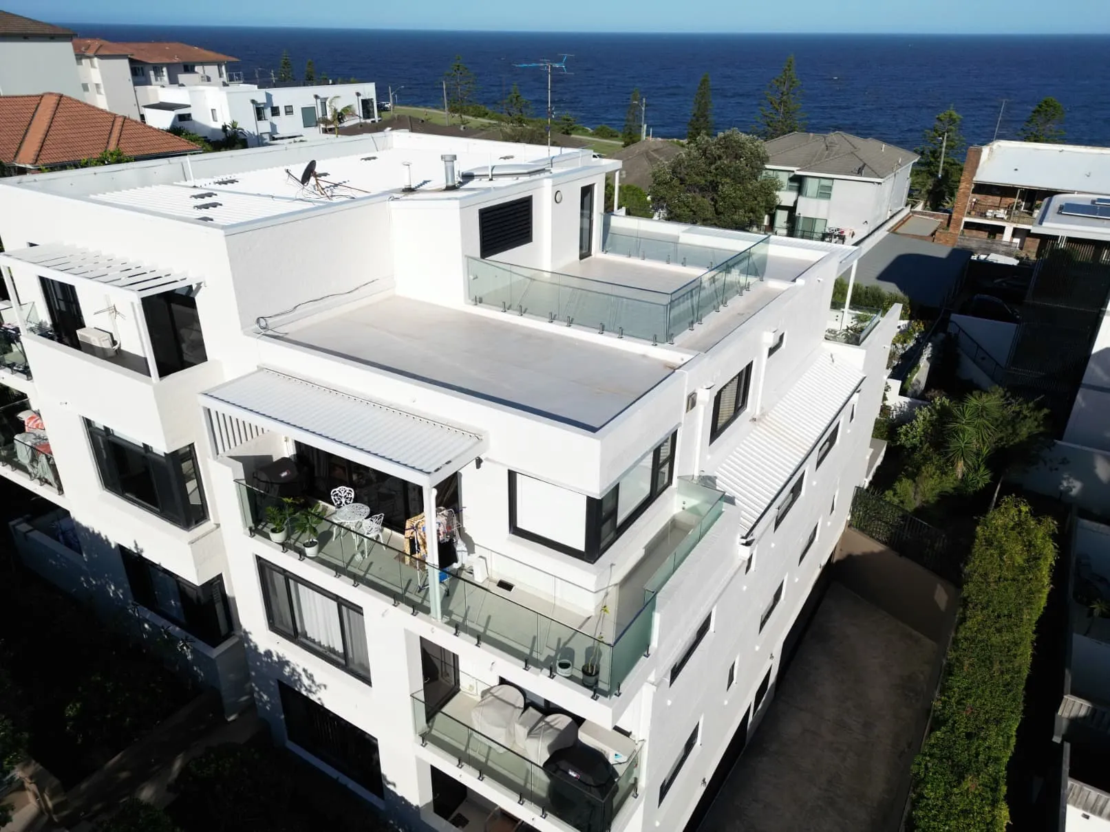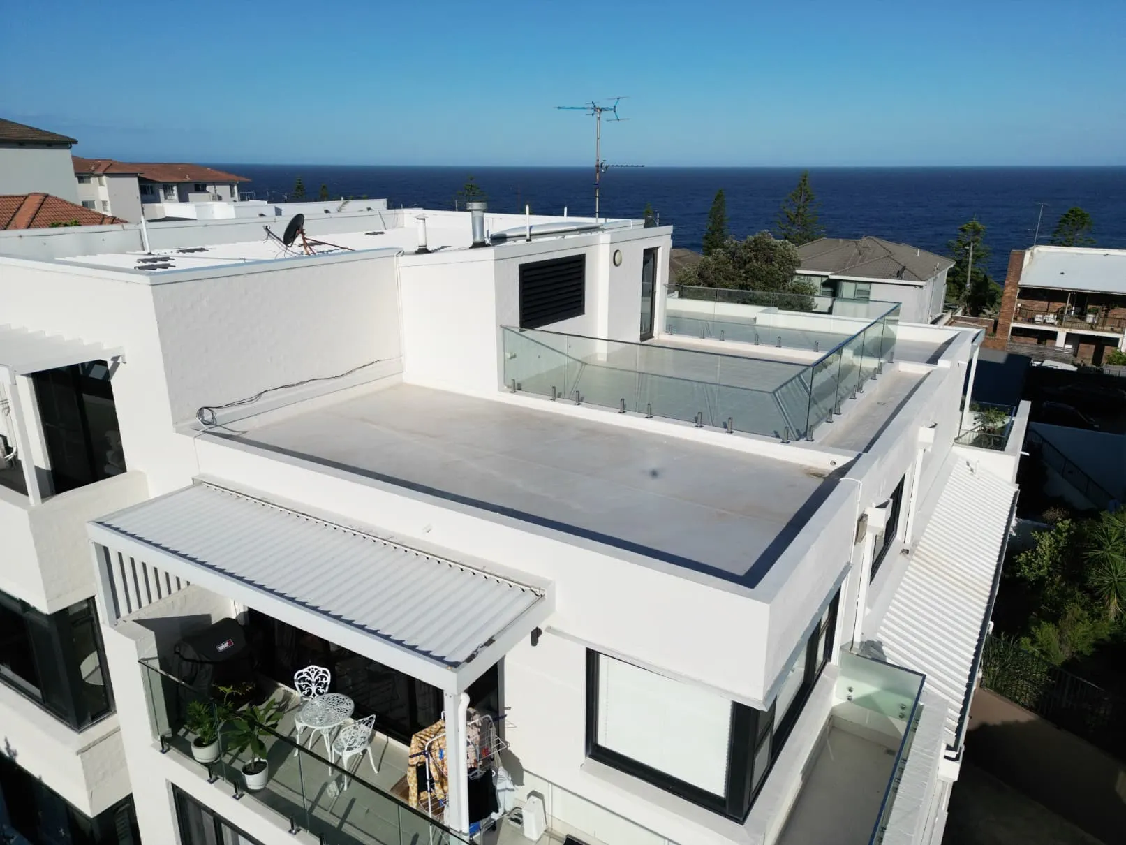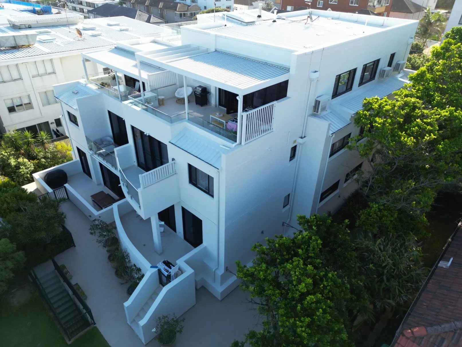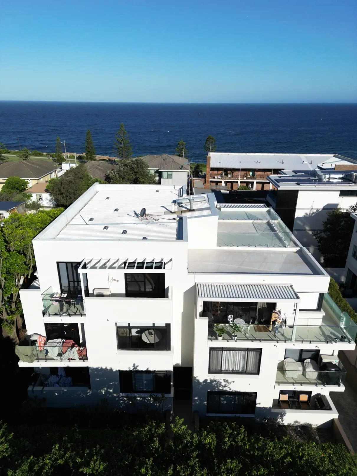 Our scope included metal roof and waterproofing system replacement, complete balcony upgrades including membranes, balustrades, doors, and floor finishes, concrete treatment and rendering repairs, and a full external commercial repaint.