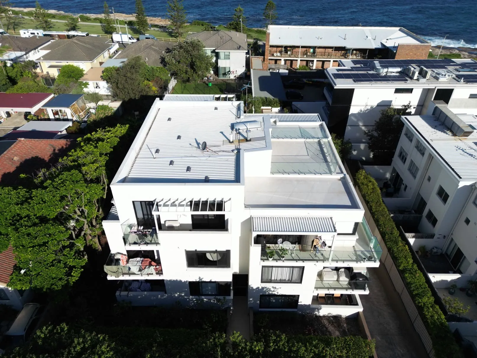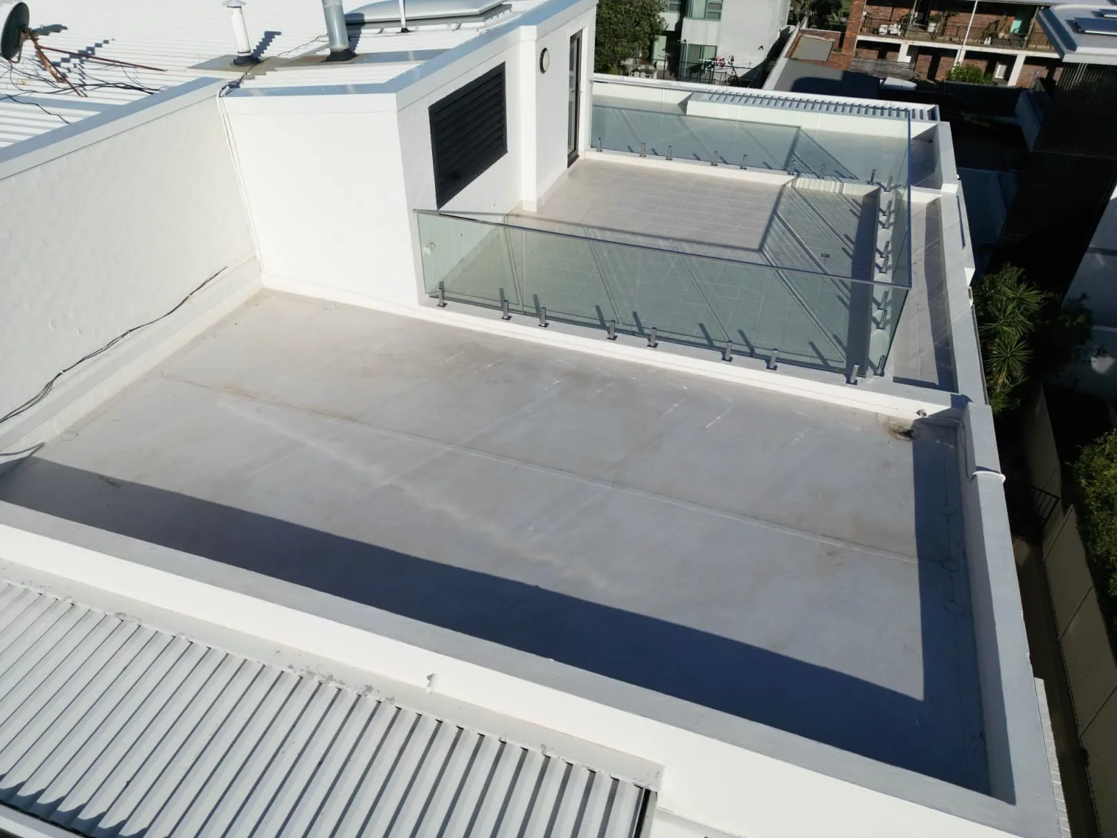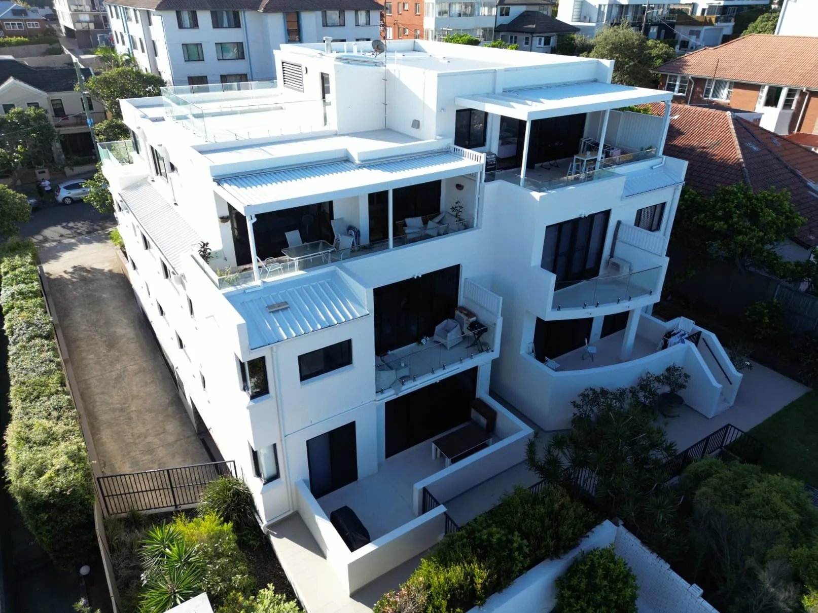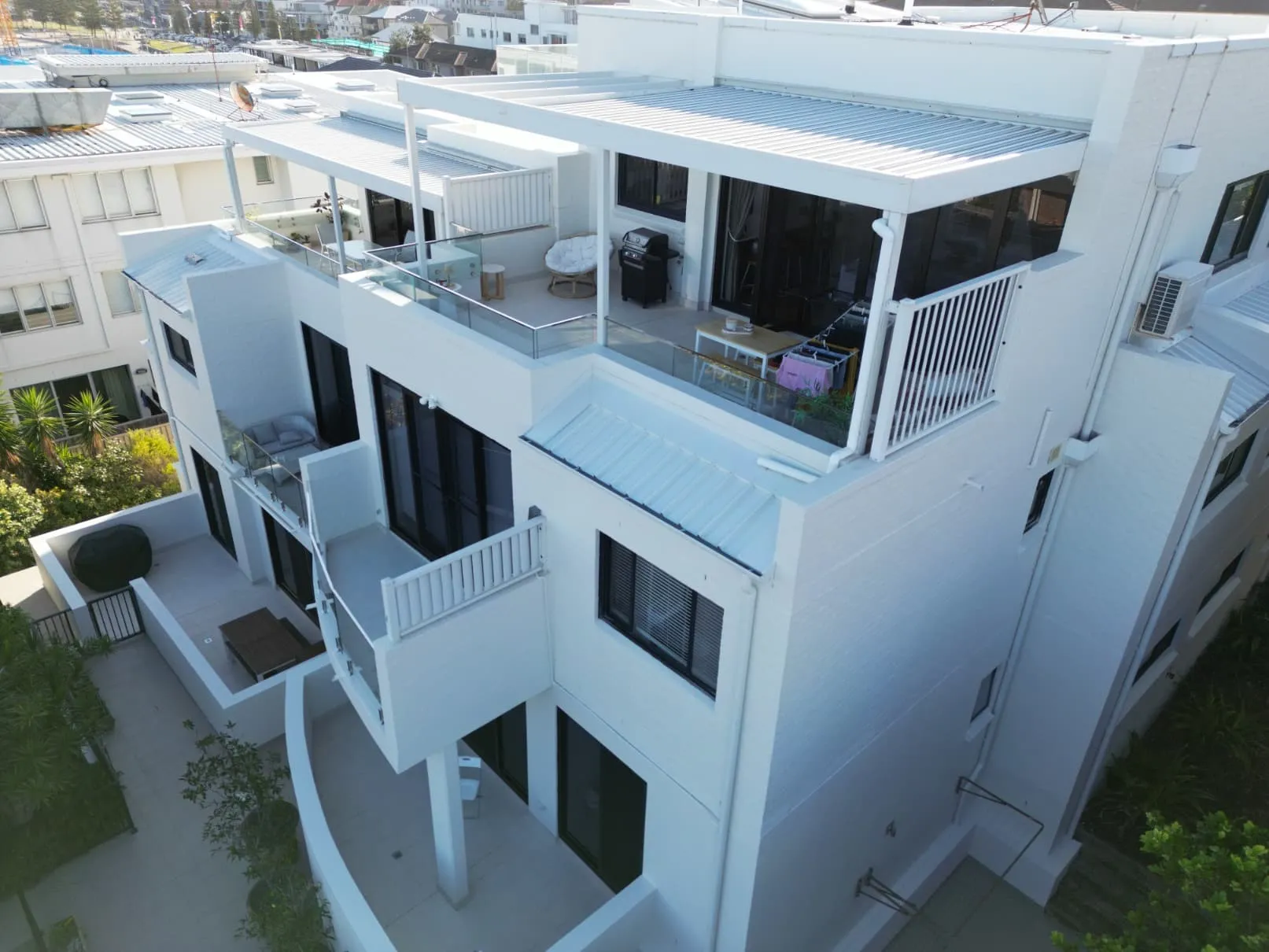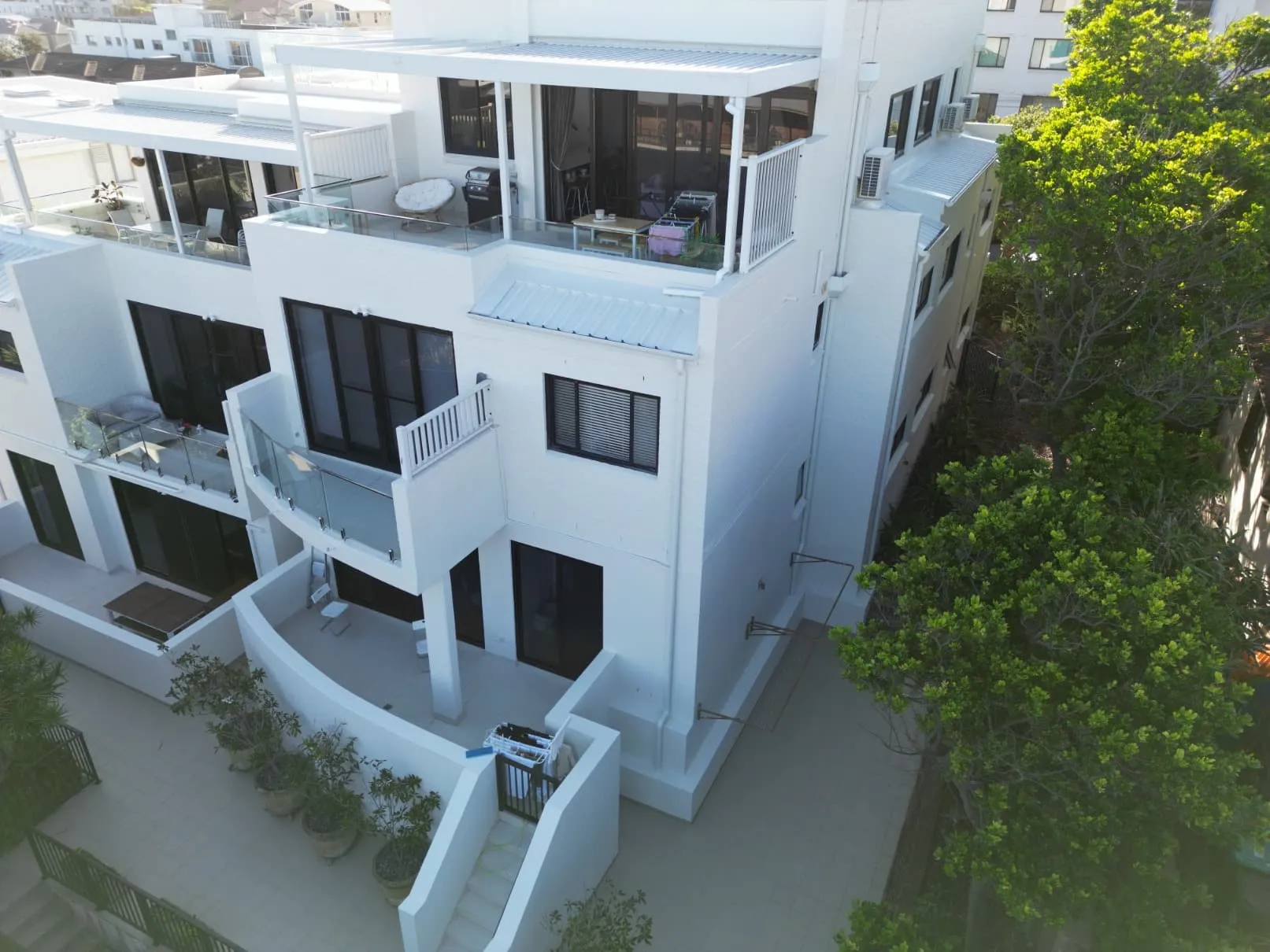 Our scope included metal roof and waterproofing system replacement, complete balcony upgrades including membranes, balustrades, doors, and floor finishes, concrete treatment and rendering repairs, and a full external commercial repaint.