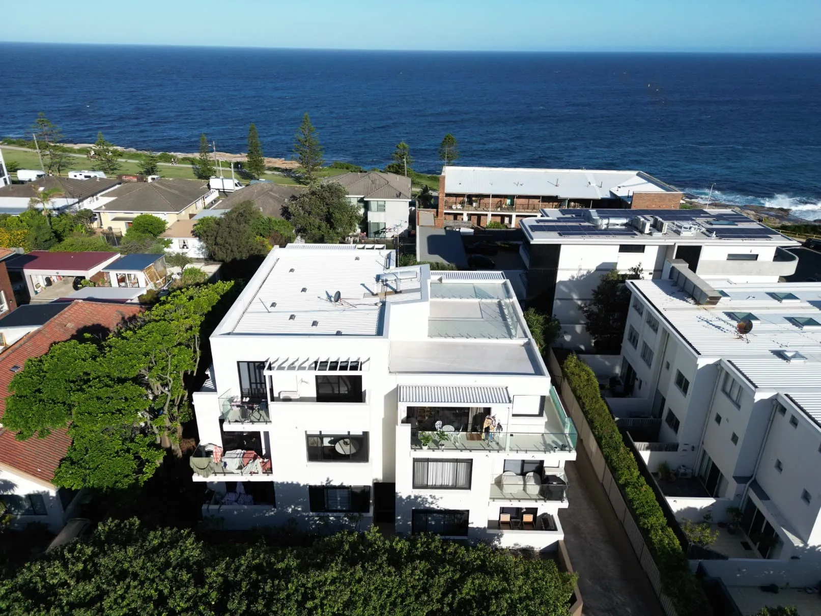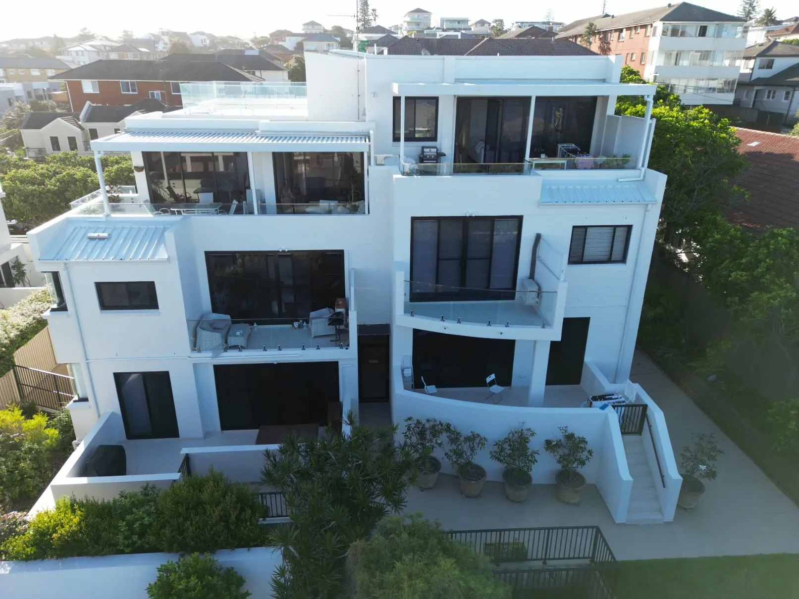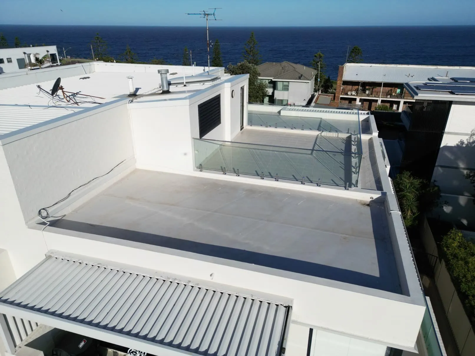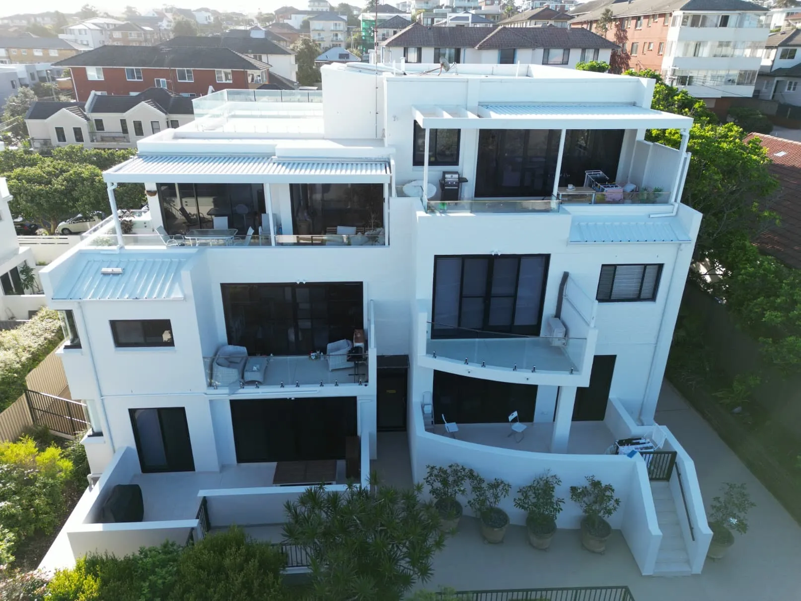 Our scope included metal roof and waterproofing system replacement, complete balcony upgrades including membranes, balustrades, doors, and floor finishes, concrete treatment and rendering repairs, and a full external commercial repaint.